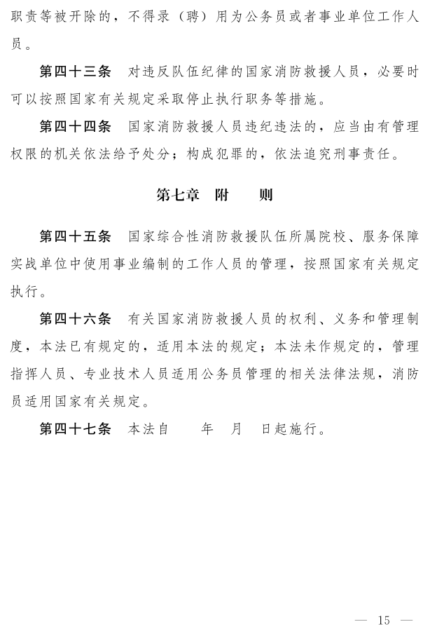 《中華人民共和國 消防救援人員法(草案)》已于2月27日公布,社會(huì)公眾可以直接登錄中國人大網(wǎng)或 法律法規(guī)數(shù)據(jù)庫提出意見,也可以將意見寄送全國人大常委會(huì)法制工作委員會(huì)(北京市西城區(qū)前門西大街1號,郵編:100805。信封上請注明 消防救援人員法草案征求意見)。